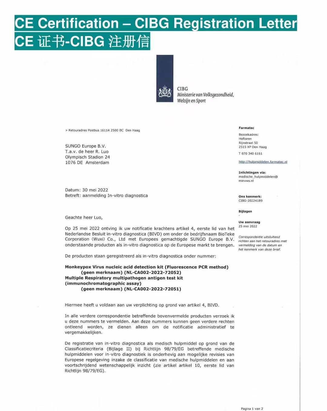 5月20日,百泰克生物再传喜讯,公司紧急开发的猴痘核酸检测试剂盒获得CE注册,成为江苏首批12个厂家之一、无锡唯一可出口欧盟助力海外猴痘病毒防治的产品。